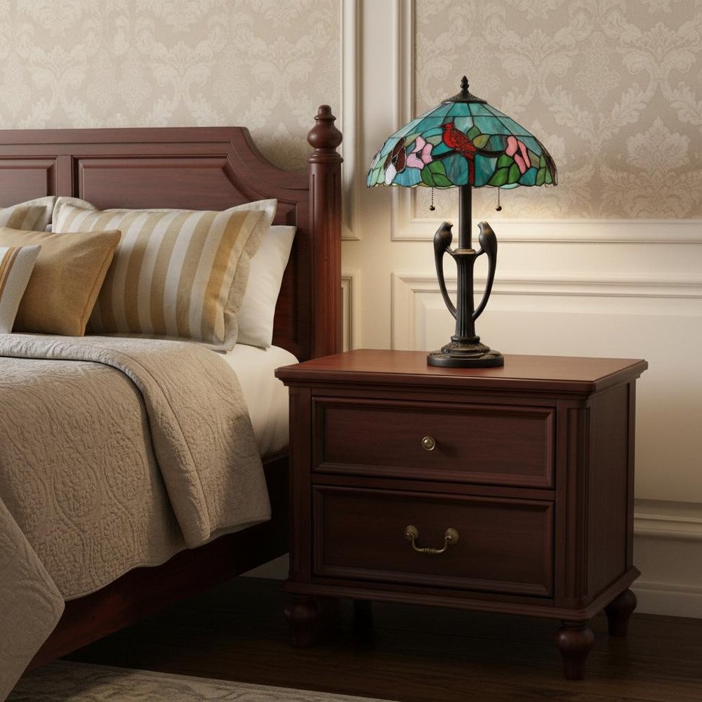 22" Bronze Two Light Tiffany Table Lamp With Aqua and Red Floral Shade