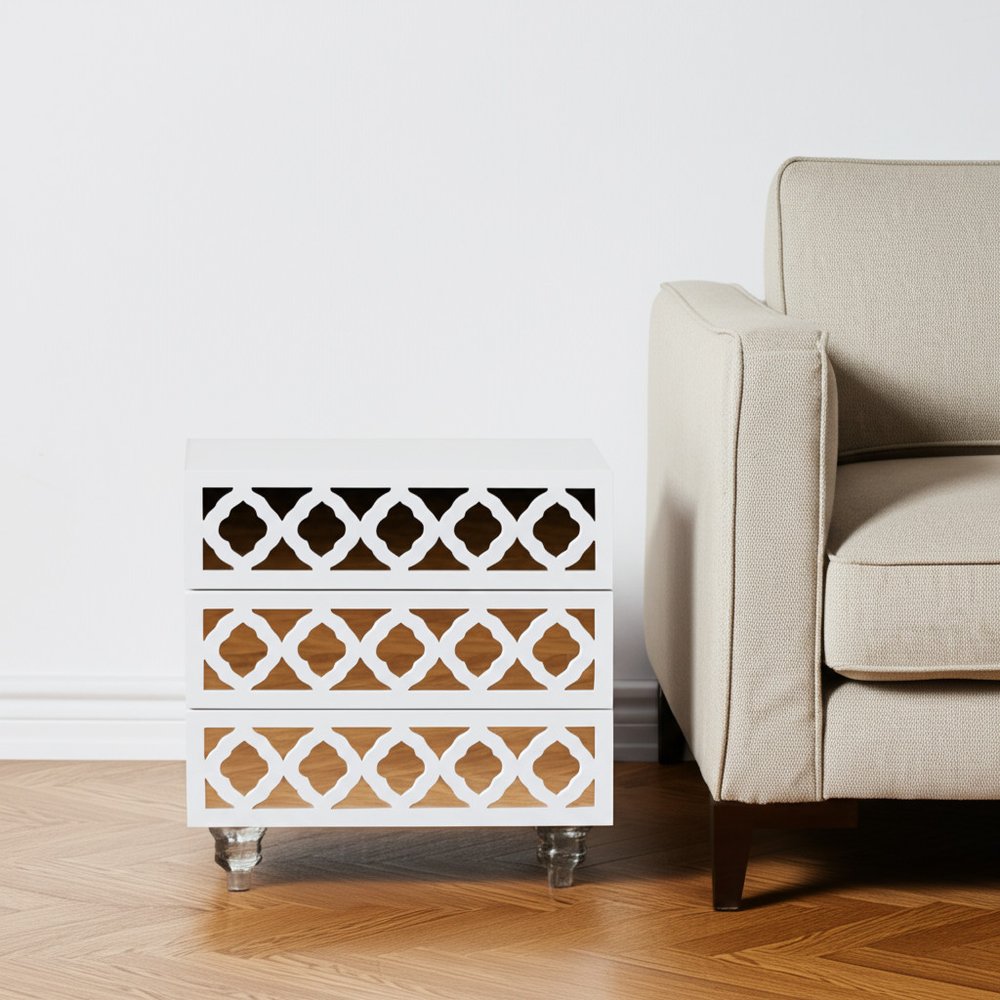 24" Clear And White Wood Mirrored End Table With Three Drawers