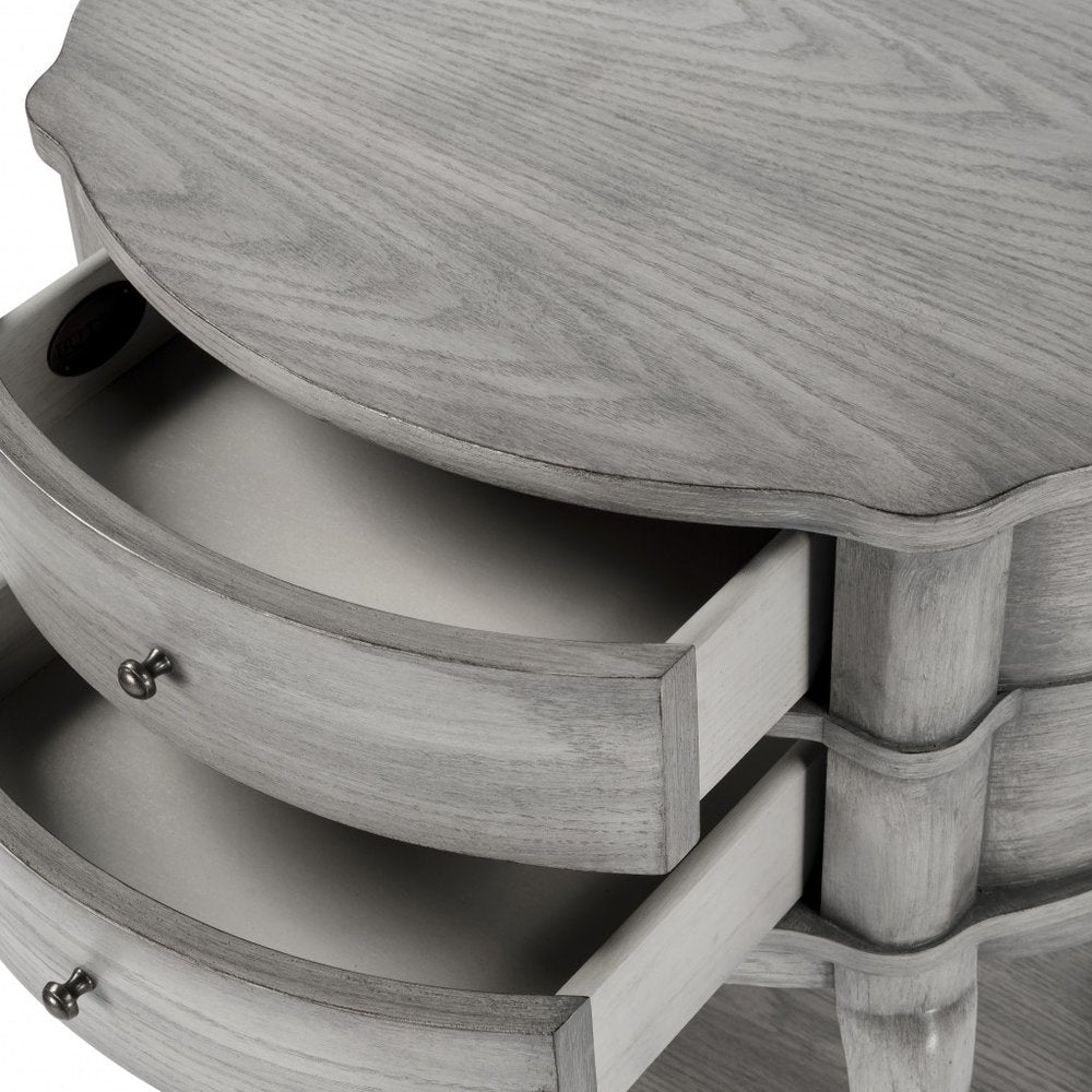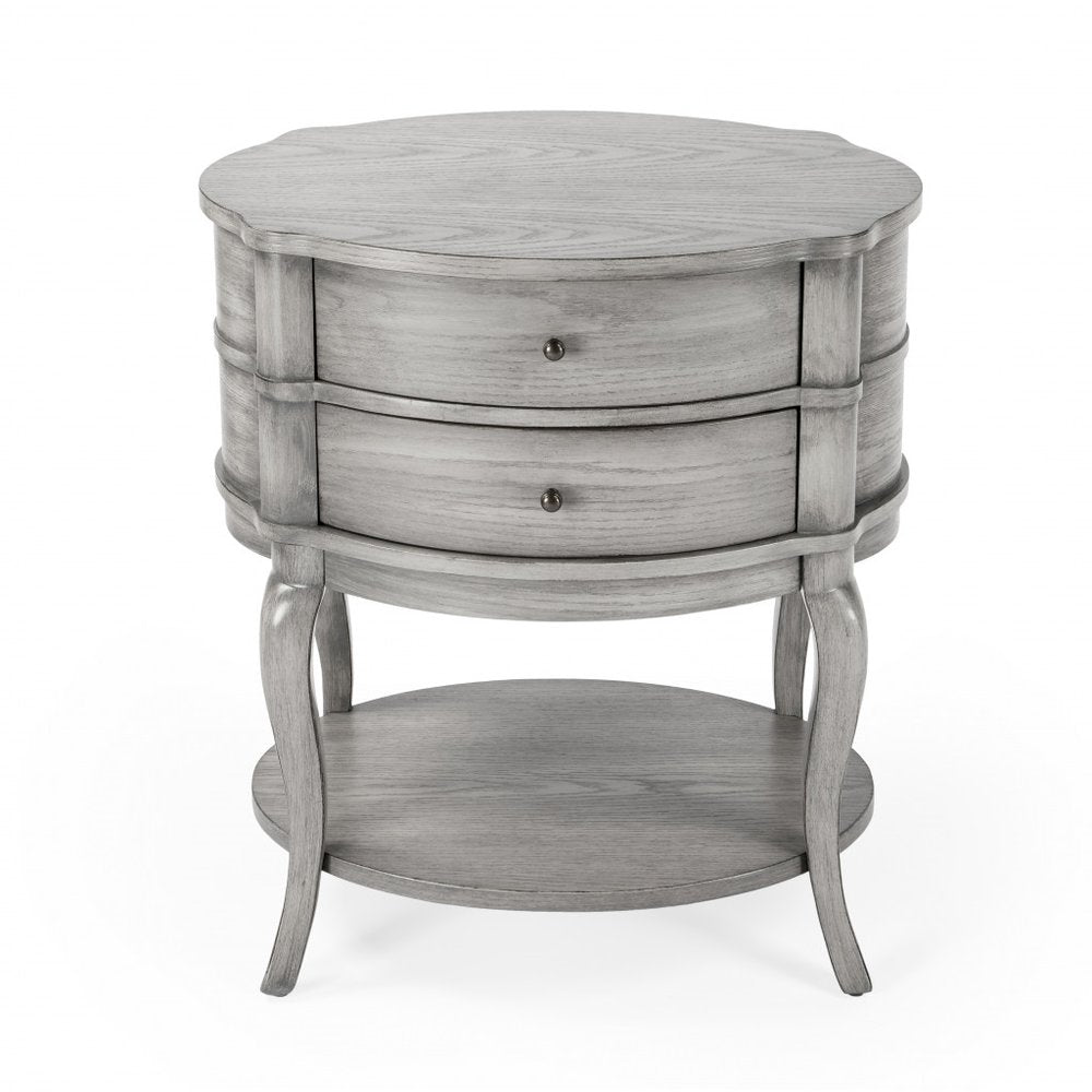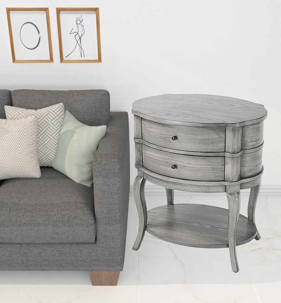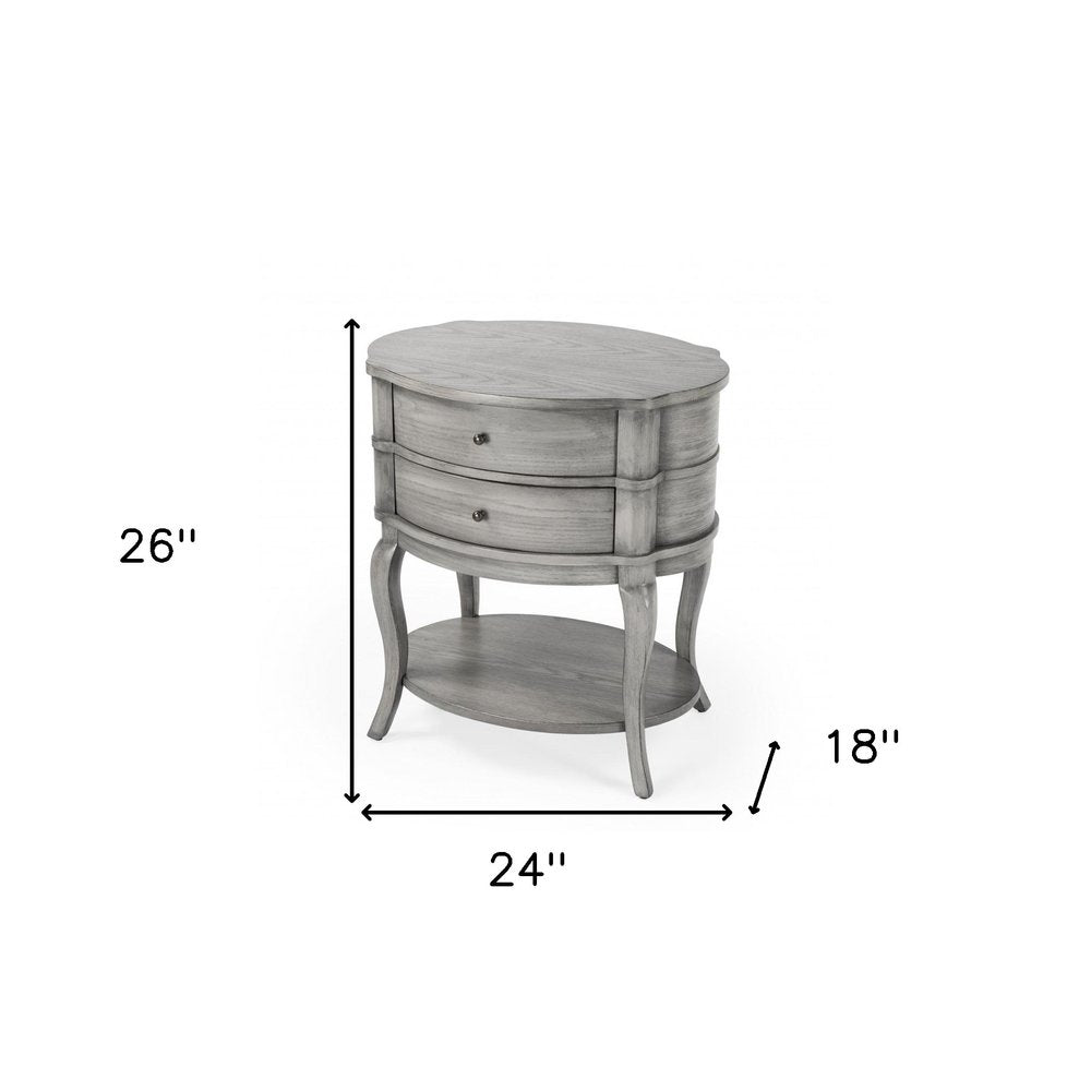 26" Gray Wood Oval End Table With Two Drawers And Shelf