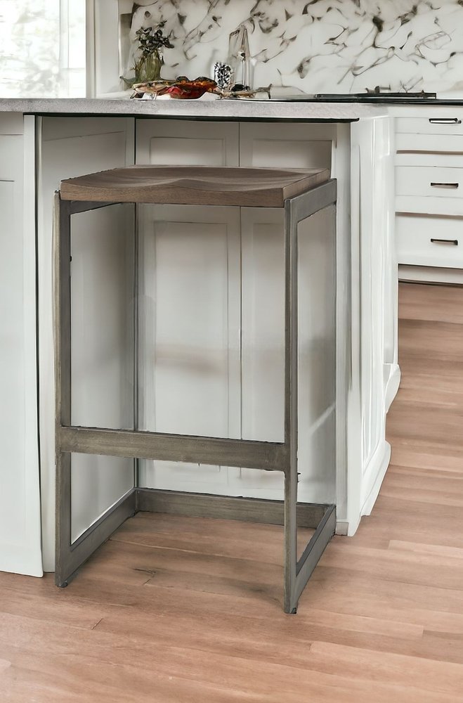 30" Wood Brown And Gray Solid Wood And Metal Backless Bar Height Bar Chair