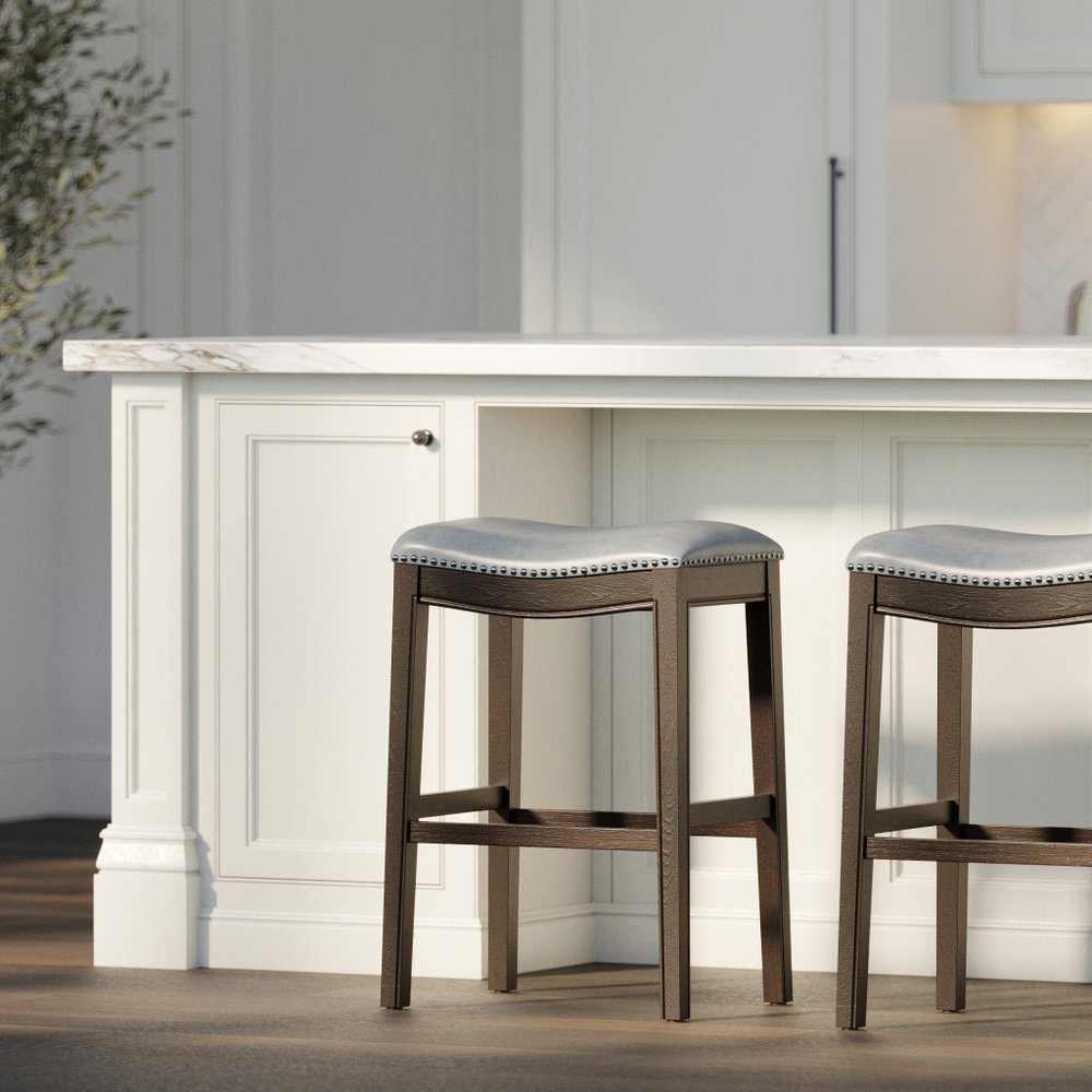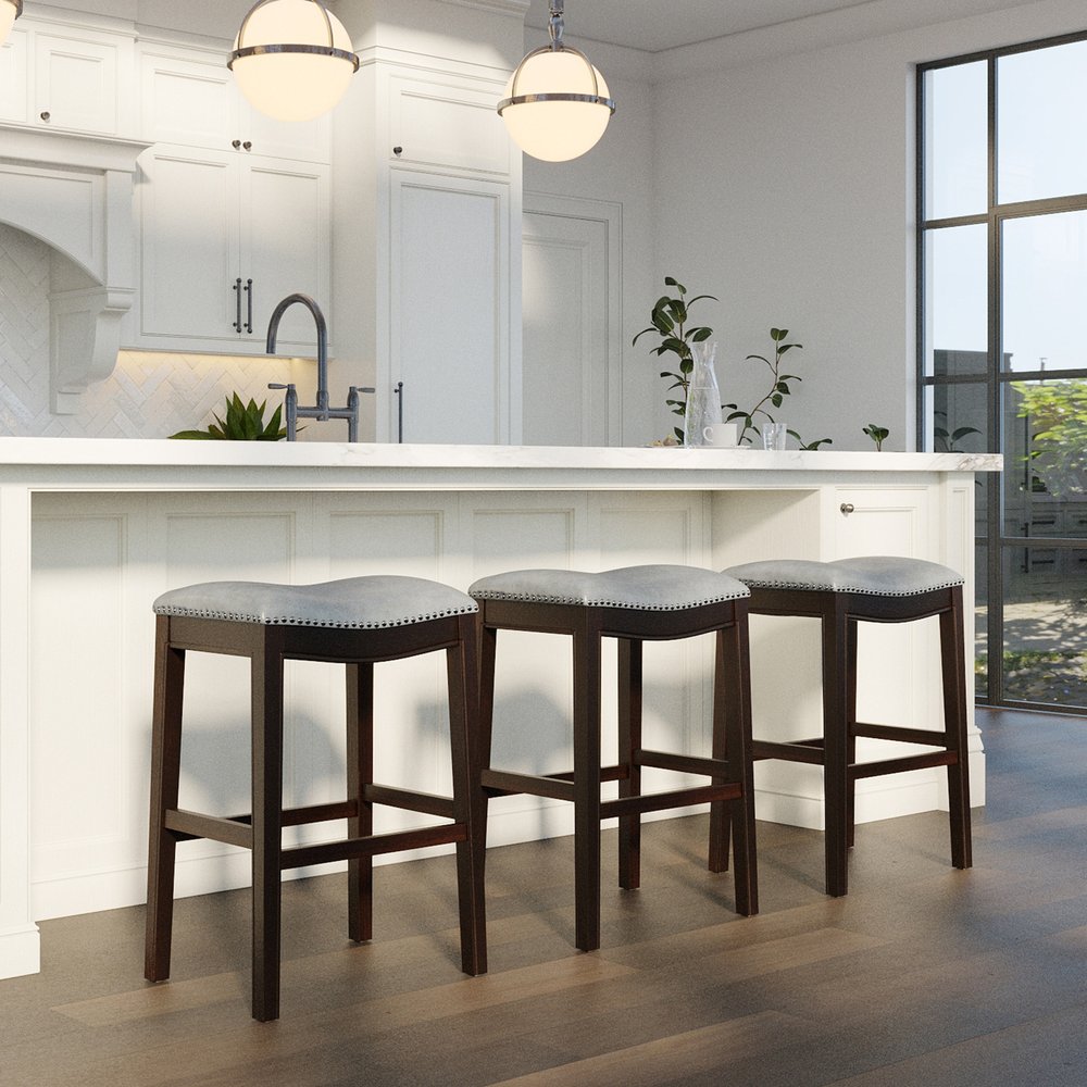 31" Gray and Espresso Faux Leather and Solid Wood Backless Bar Height Bar Chair