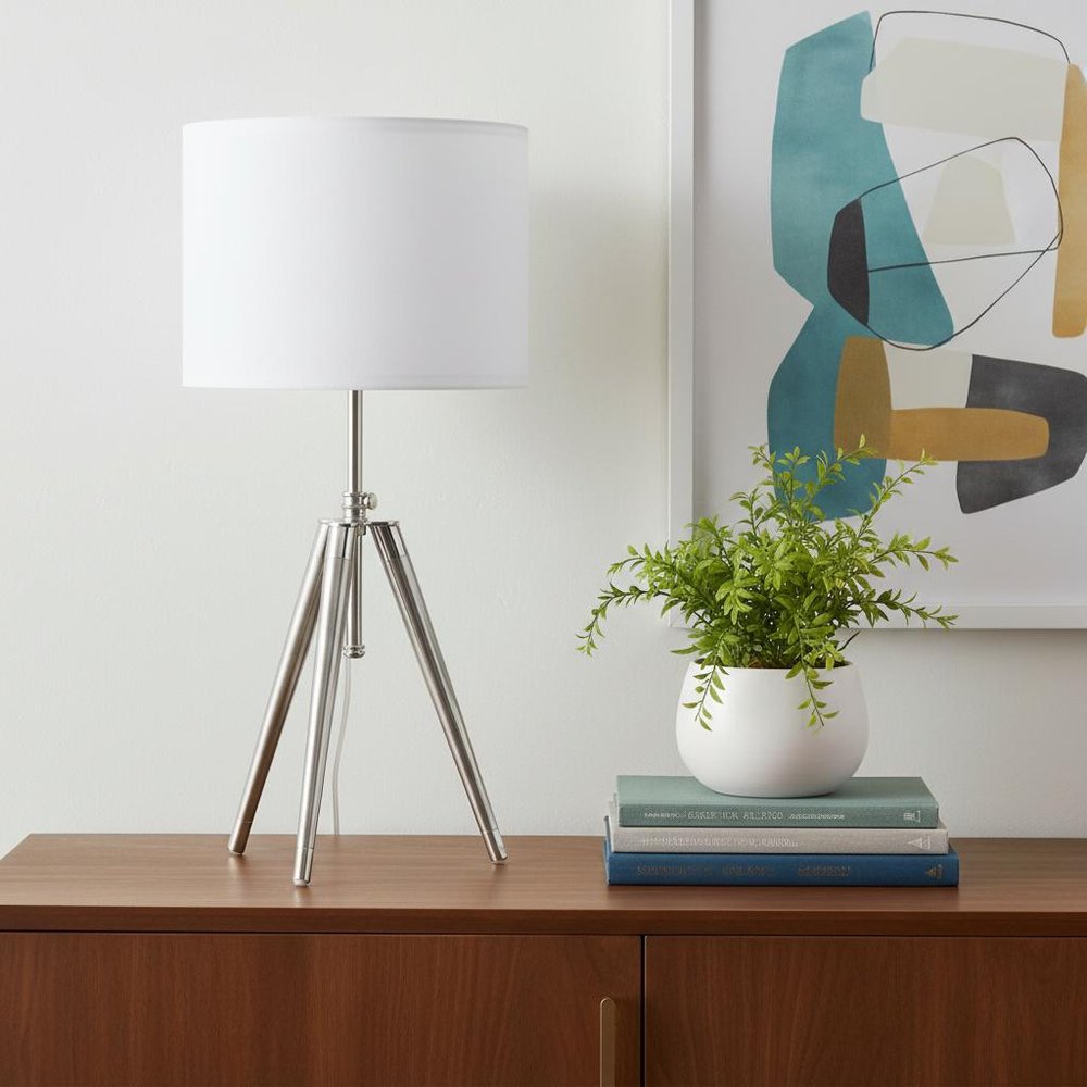 34" Silver Metal Adjustable Tripod Table Lamp With White Round Shade