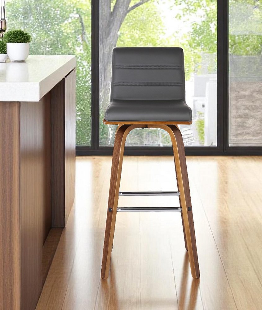 30" Gray and Brown Faux Leather and Solid Wood Low Back Bar Height Swivel Bar Chair