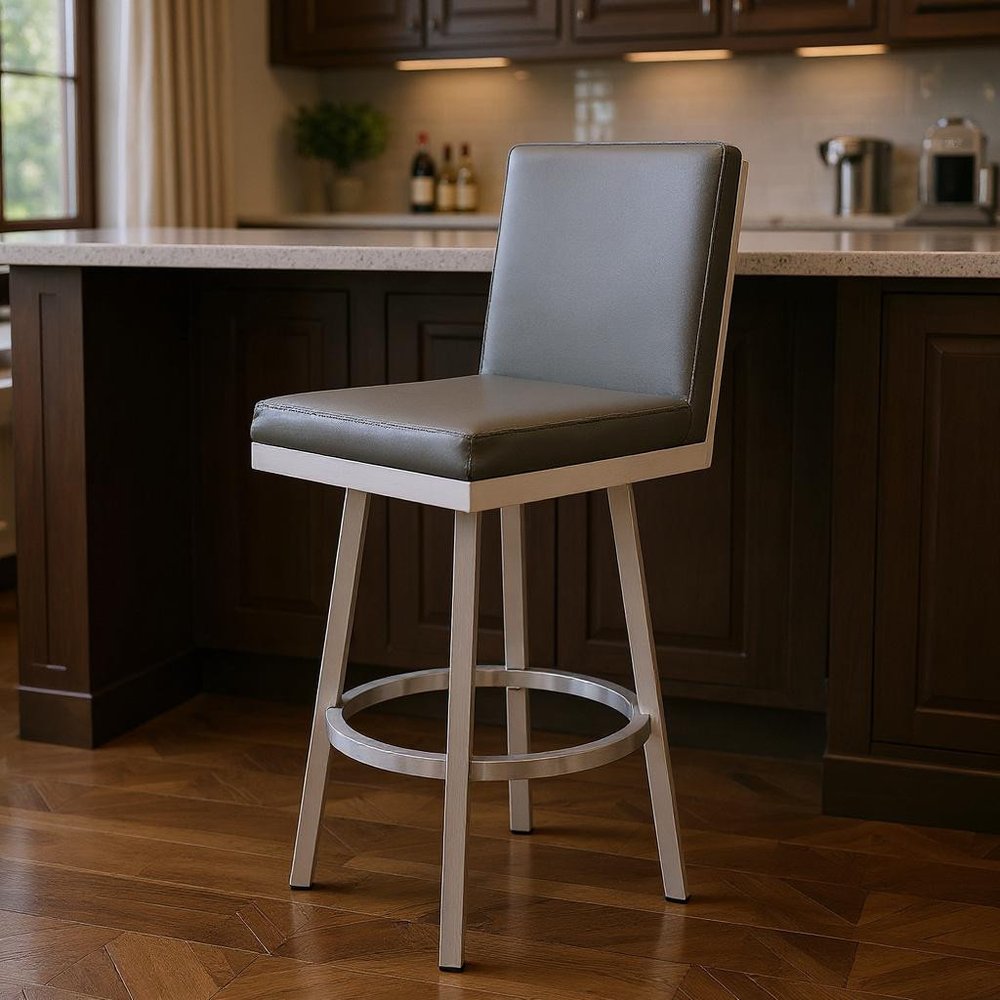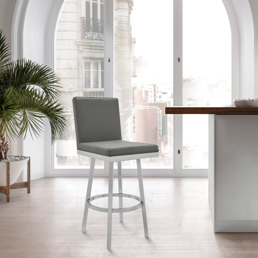 30" Gray And Silver Faux Leather And Iron Swivel Bar Height Bar Chair