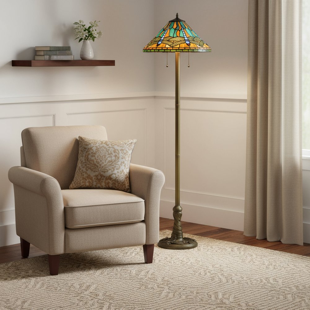 light traditional shaped floor lamp, traditional shaped floor lamp blue, shaped floor lamp blue orange, floor lamp blue orange dragonfly, dragonfly tiffany glass empire shade |