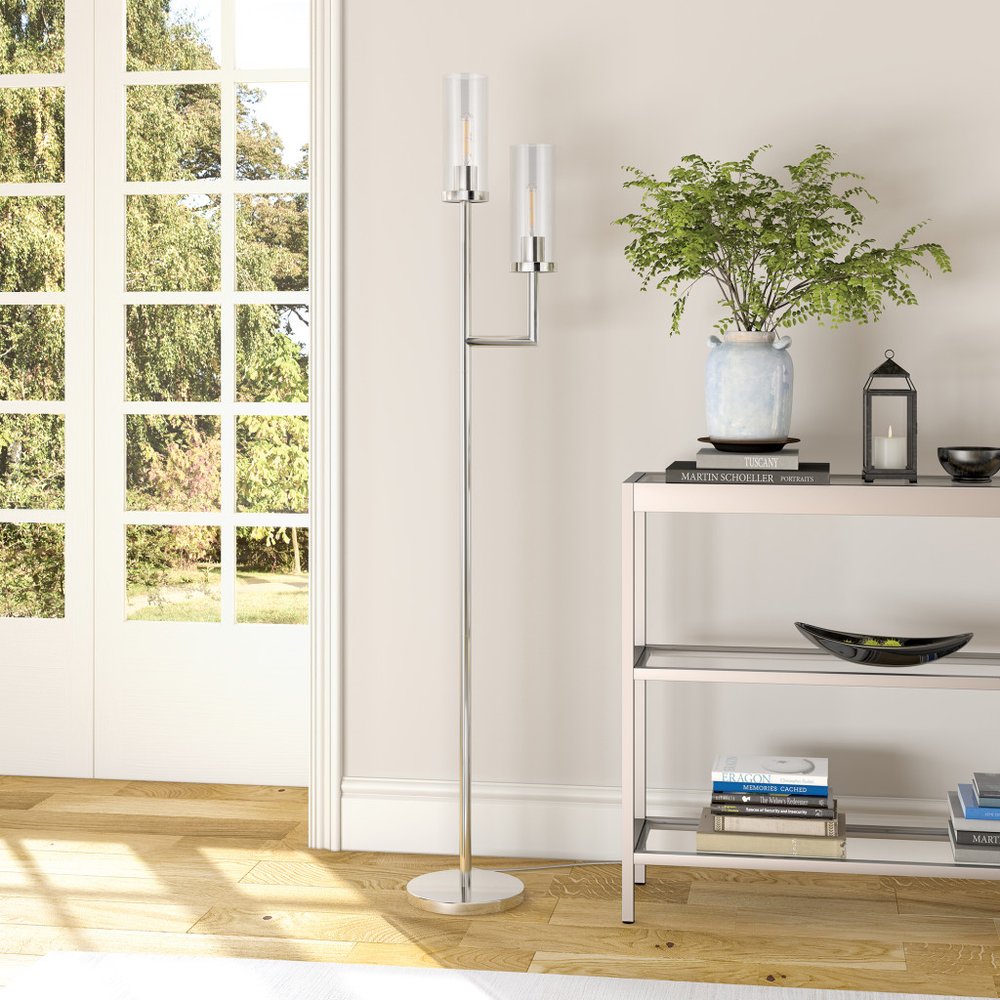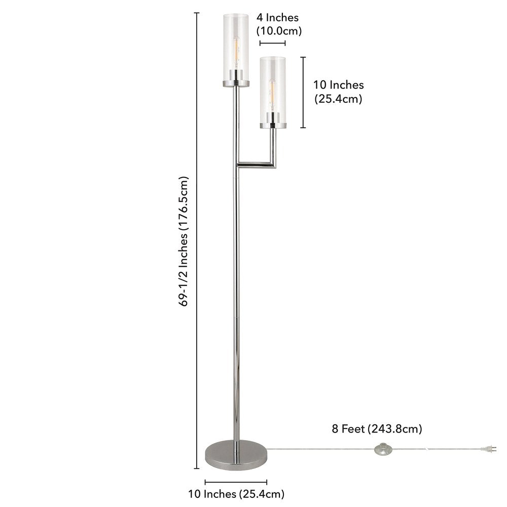 Add a bright anchor to your room with this 69-inch nickel two light torchiere floor lamp with clear transparent glass drum shade. The base of this lamp is made of nickel metal. The lamp light itself is covered by a glass, drum shaped shade, making this a classy piece that will complement most any interior. Add a soft warm glow to your space with this classic torchiere styled lamp. A straight pole extends upwards from a single base while the scooped shade shape refracts light upward and outward much like it's name sake,a torch. High quality design makes this a great lamp for not only lighting, but accenting a room with style. The perfect lamp to create just the right natural and soothing light in your space. 69-inch H x 11-inch W x 11-inch D