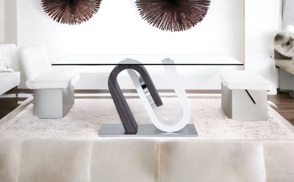 71" Clear And White and Gray Glass And Stainless Steel Pedestal Base Dining Table