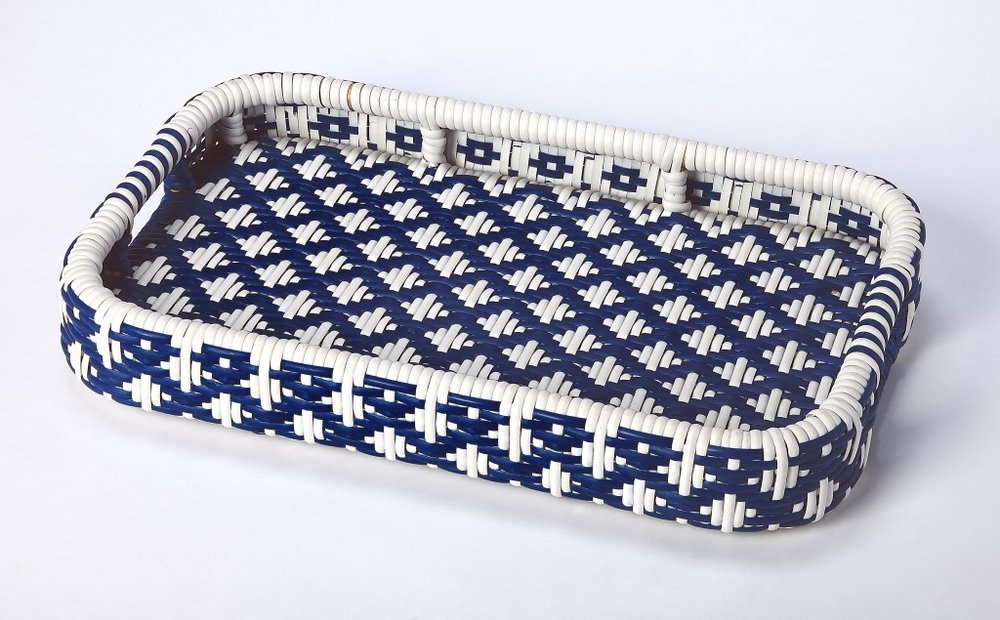 35" Navy Blue White And Natural Rolling Rattan Bar Cart