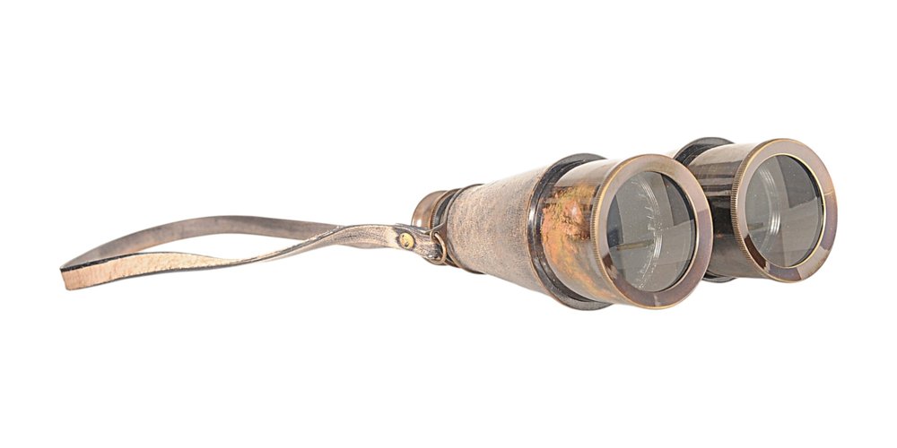 Rustic Brass And Leather Binoculars In Wood Storage Box