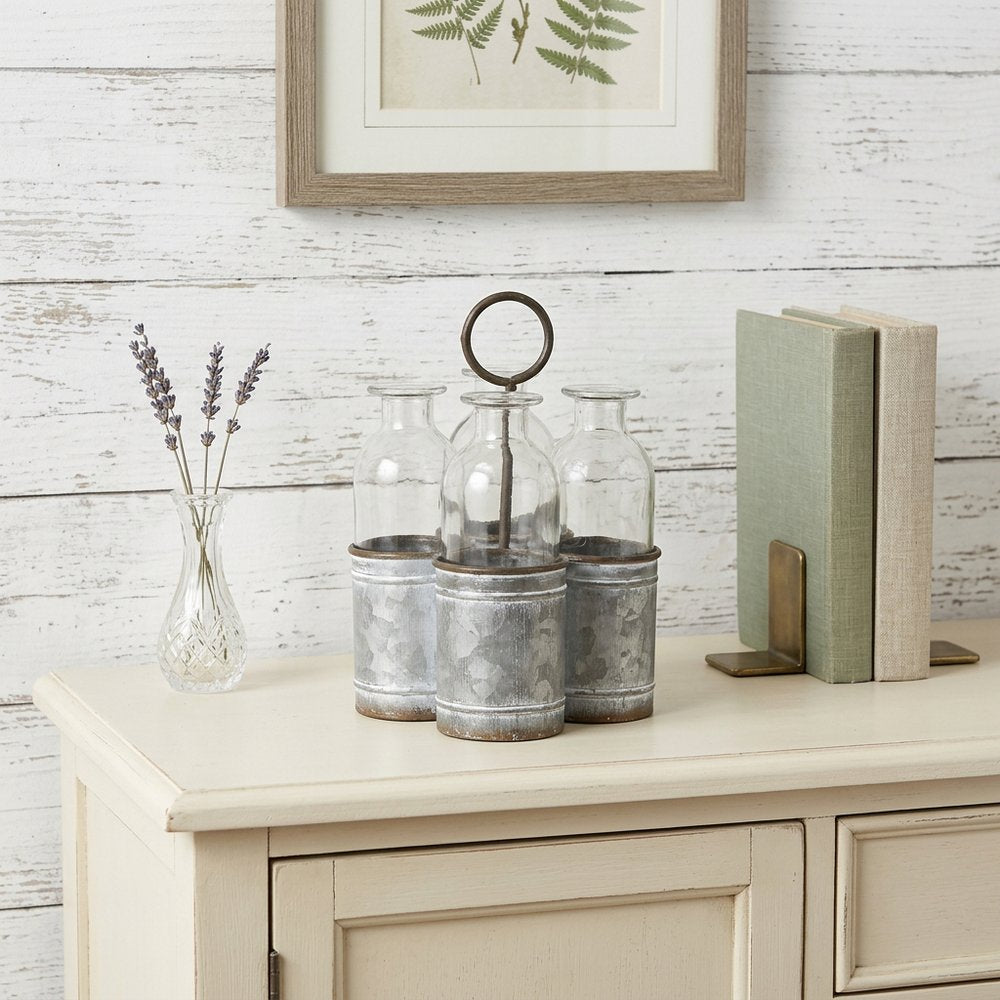 Set of Four Clear Galvanized Metal and Glass Decorative Bottle Tabletop Sculpture