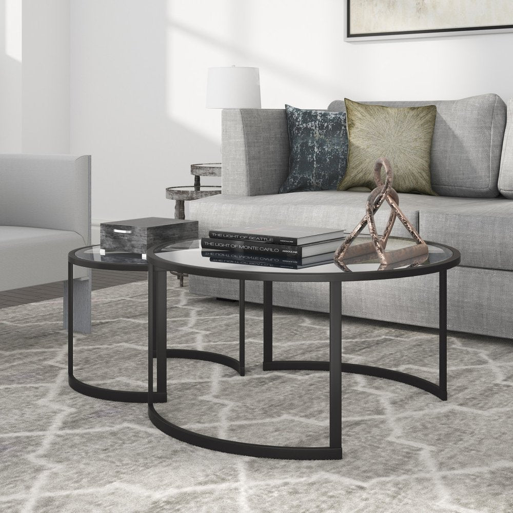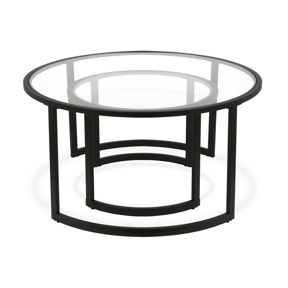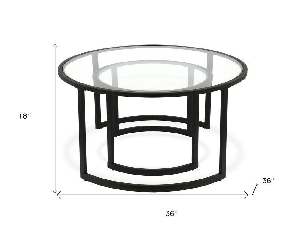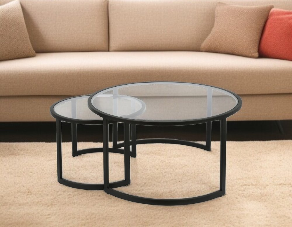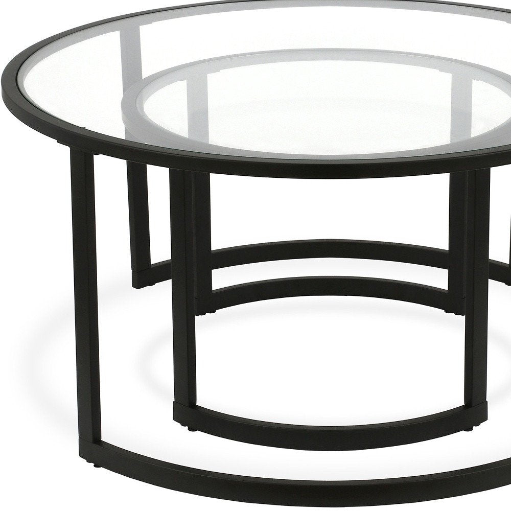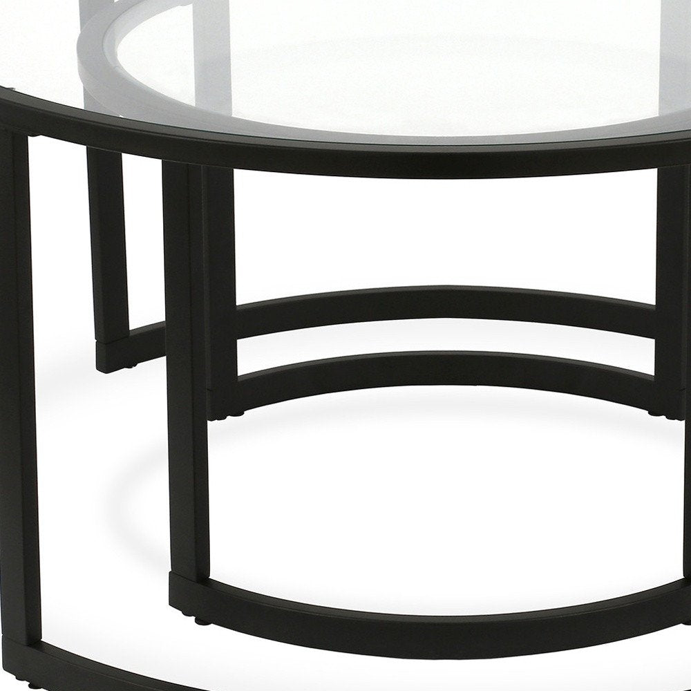 Set of Two Black Glass And Steel Round Sled Nested Coffee Tables